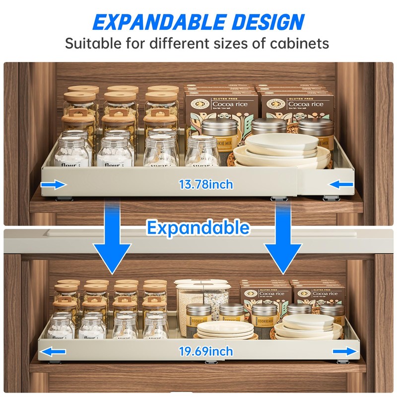 • 【EXPANDABLE SHELVES】Say goodbye to wasted space! Adjustable width from 13.78 inches to 19.69 inches, 16.9 inches deep and 1.7 inches high. Our pull-out shelves optimize cabinet space and provide easy access to deep storage items. Keep your kitchen neat and efficient while maximizing storage potential with our space-saving solutions.