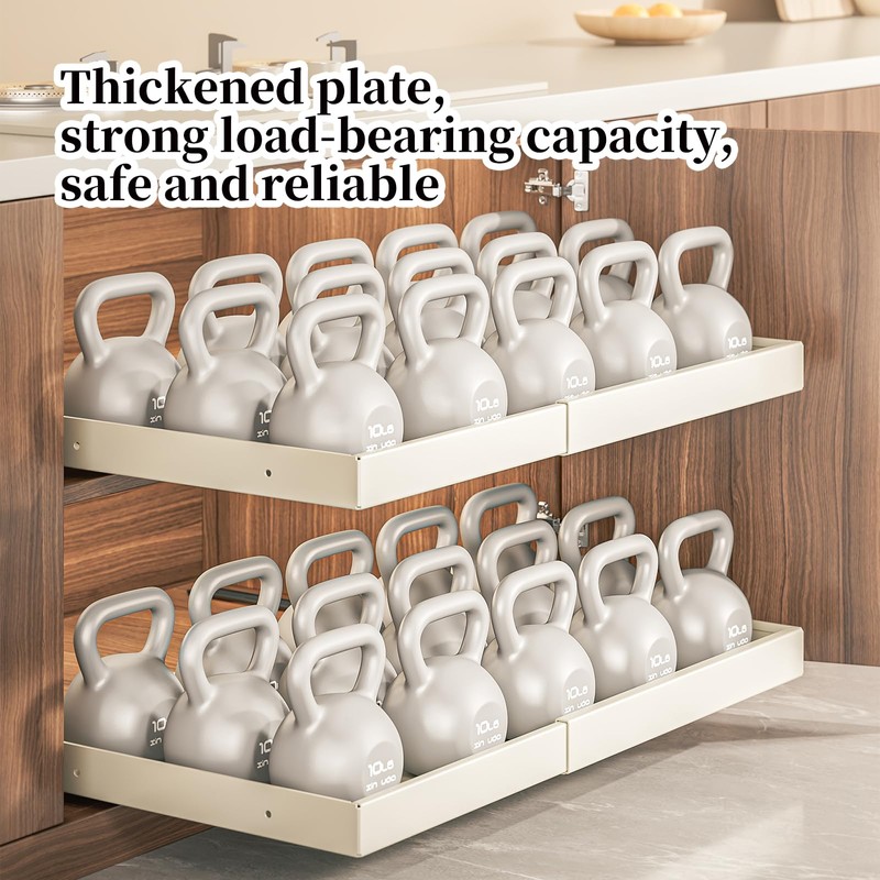 • 【UPGRADED 3 RAILS】Our cabinet organizers are designed with high quality metal and precision dampened rails for durability and quiet operation. Tested for over 40,000 cycles, it opens and closes seamlessly, ensuring a peaceful kitchen atmosphere every time.3 Rails for greater load-bearing capacity, no sagging or warping, and more reliability.