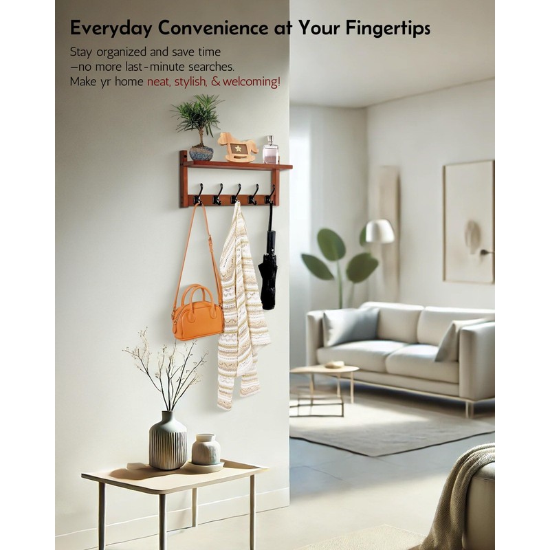 - Generous Storage Space: Each coat hook wall mount features a top shelf, ideal for displaying plants, photo frames, or storing essentials. Equipped with 5 sturdy hooks, it's perfect for hanging coats, jackets, hats, bags, towels, kitchen items, and more