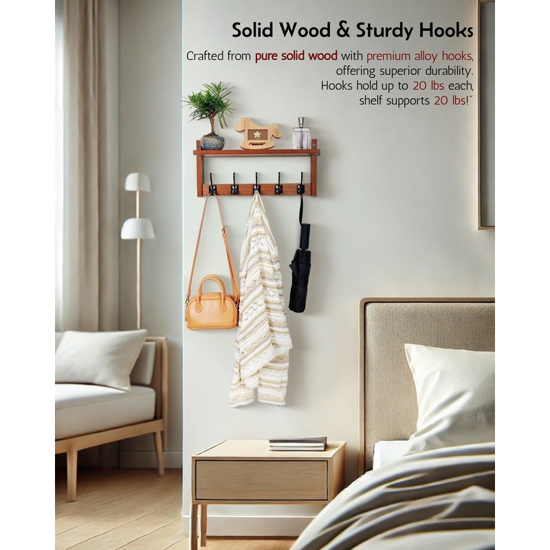 Exper City Coat Rack Wall Mount with Shelf, 26IN Wooden Coat Hanger Hooks Wall Mount with 5 Metal Hooks, Hanging Shelf with Hooks, Retro Walnut