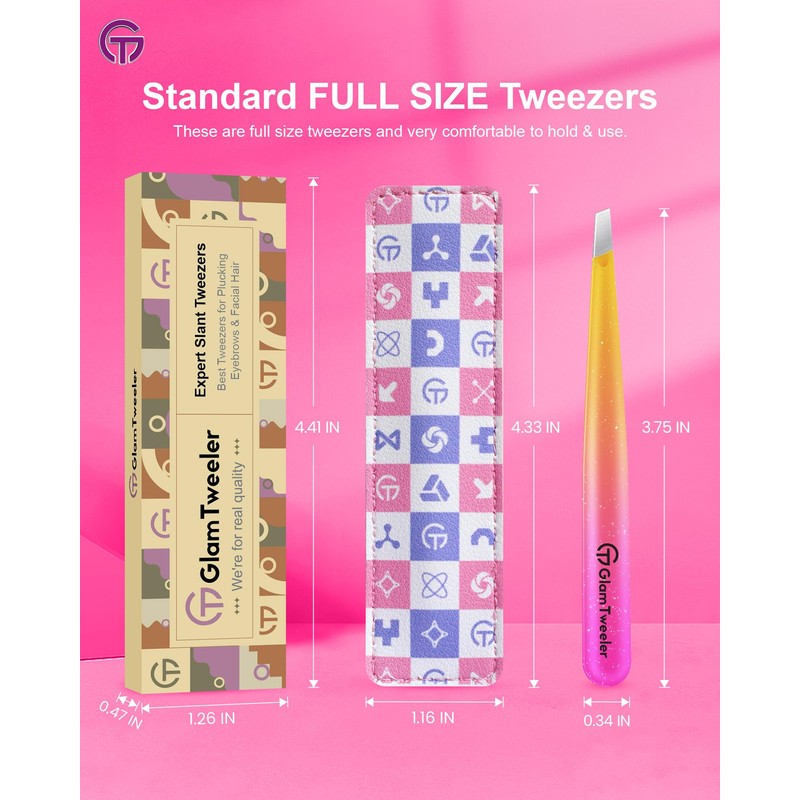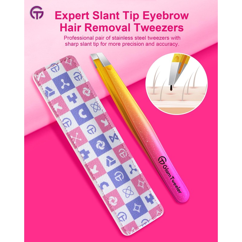 Expert Eyebrow Hair Removal Tweezer with Leather Case, GlamTweeler High Precision Slant Tip Stainless Steel Tweezers for Men and Women (Sparkle Fuchsia & Yellow)