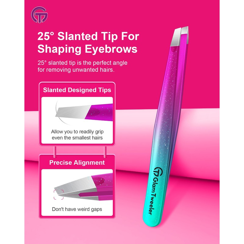 Expert Slant and Point Tip Tweezer Set with Exclusive Travel Case, GlamTweeler Sharp & Precision Tweezer Set for Eyebrows, Facial Hairs & Fine Hairs Removal (Sparkle Purple & Turquoise + Silver)