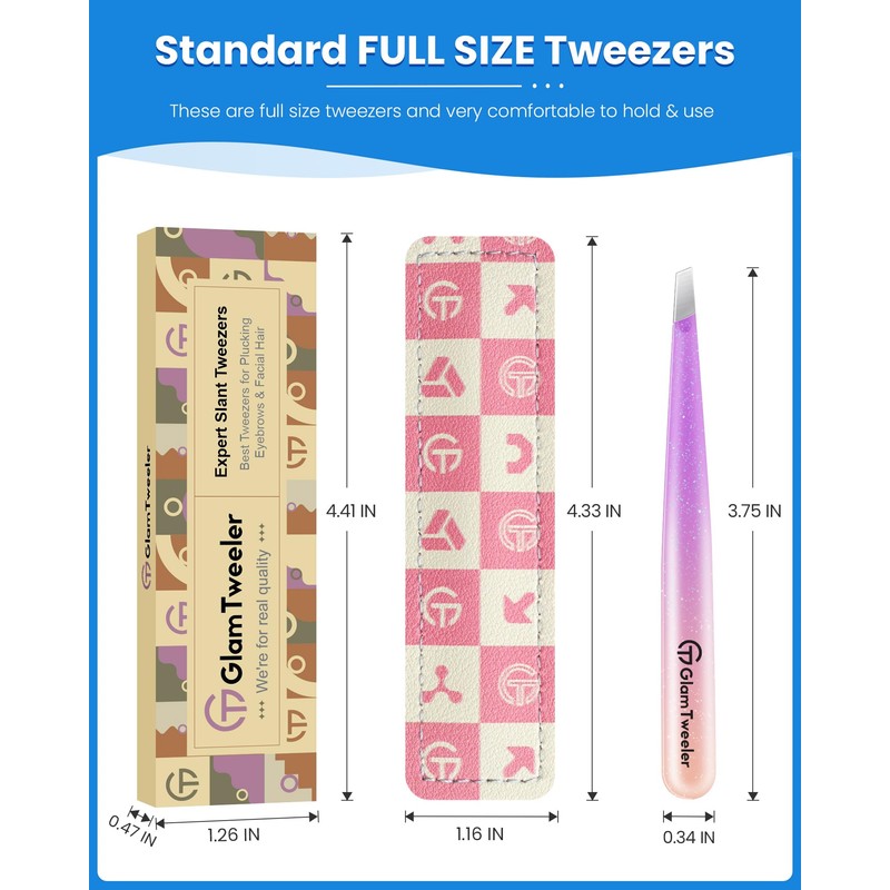 - 【Standard FULL SIZE Tweezers】The tweezer dimensions are 3.75"x0.34" /95.2x8.6mm (L x W). They are full size and very comfortable between your fingers, perfect for travel or throwing in your purse. These slant tweezers are great for daily grooming and general tweezing. The regular size is also perfect for plucking on the go if needed.