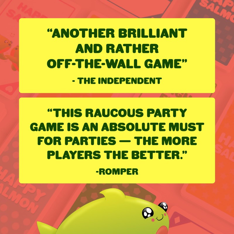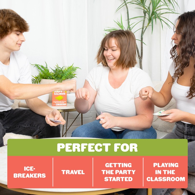 - How to Play: Dive into the fun with Happy Salmon! Each player has a stack of action cards and must shout out their actions to find a match. Complete the action with a partner and discard the cards. The first to finish all their cards wins!