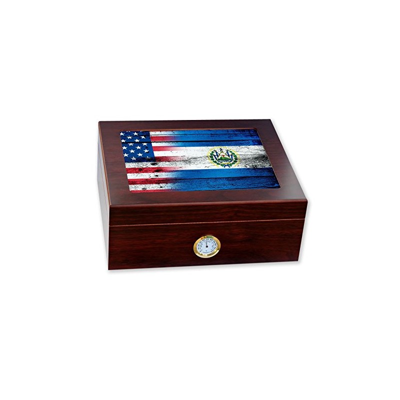 ExpressItBest Premium Desktop Humidor - Glass Top - Flag of El Salvador (Salvadorian) - Wood with USA Flag - Cedar lined with humidifier & front mounted hygrometer.