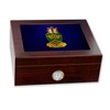 • QUALITY: High quality humidor with a cherry finish, glass top over a vividly colorful image, gold plated internal locking hinges and lined with Spanish cedar.