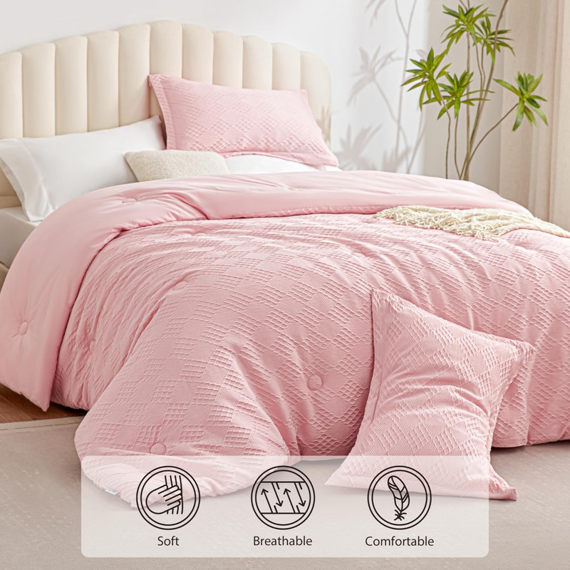 EXQ Home Waffle Comforter Queen Size - Super Soft Embossed Design Comforter Set 3 Pieces, Pink 3D Diamond Pattern Bedding Set,Winter Warm Bed Set,1 Comforter with 2 Pillowcases