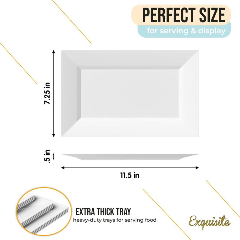 These heavy duty 11.5 in. white rectangular plates are a beautiful and creative way to serve with class! Each package contains 40 white rectangular shaped plastic plates which can be used over and over again or disposed of for easy clean-up. These low priced cheap rectangule plates are great for elegant affairs, weddings, or corporate events. Wow your guests with your creativity using these modern rectangular plates, and set the bar at an all time high! Dimensions: 11.5 in. x 7.25 in.