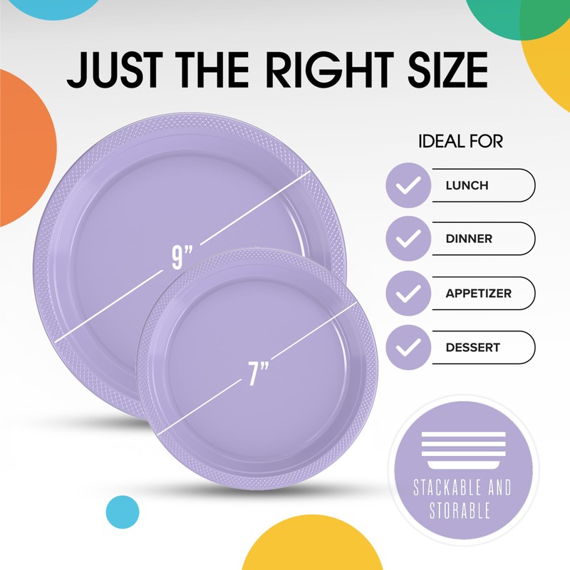 - Includes: Each pack comes with 50 Lavender 9 inch dinner plates & 50 Lavender 7 inch dessert plates These plates may be used as dinner plates or cake plate and also make a great use as picnic supplies. Having these will complete your plastic dinnerware collection.