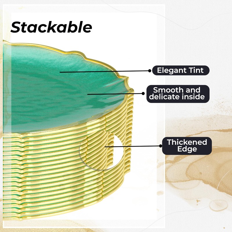 Exquisite Elegant Plastic Plates For Party 40 Dinner Plates - 40 x 7.5 inch Plastic Dessert Plates Set - Thin Delicate Fancy Plastic Plates Disposable Plates for Party Plates | Mint - Gold Rim