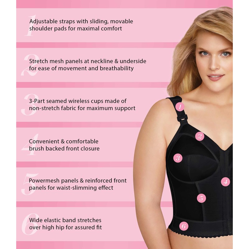 - POSTURE SUPPORT. This women's full-figure longline is designed with supportive 3-part seamed cups, power mesh waist-slimming panels and flexible side boning to help support your back, smooth your waist and correct your posture.