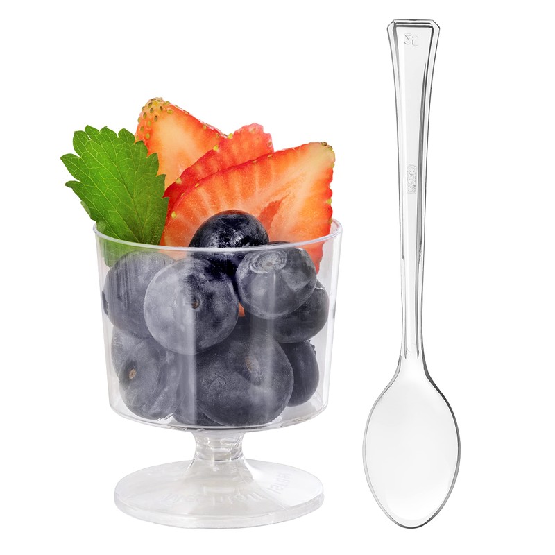 - ✔️INCLUDES: 100 2oz Clear Plastic Cups For Dessert and 100 Clear Tasting Spoons . Get The Most For Your Buck! This 200 Pcs Of Disposable Dessert Cups With Spoons Are Steal Of A Deal. At Exquisite We Pride Ourselves With Making Affordable Products Without Compromising On The Quality Or Design. Although These Mini Plastic Cups With Spoons Are Sold As Disposable But Can Be Reused!