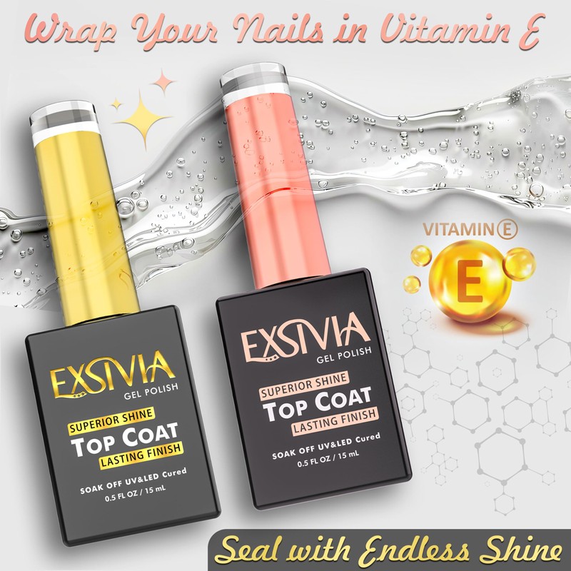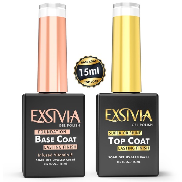 EXSIVIA Vitamin E Infused Base and Top Coat Nail Gel Strengthener, High Endless Glossy Shine, No Wipe, Chip Resistant, Nail Gel Polish Base and Top Coat, Soak Off LED UV Lamp Manicure Kit, 15mL