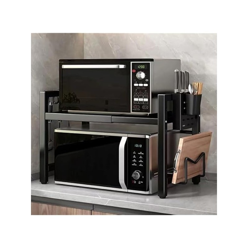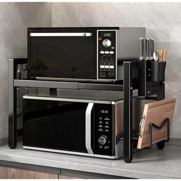 Extendable Microwave Oven Rack, 15.7~24.8" L Expandable Microwave Stand with Storage Shelf Heavy Duty with 6 Hooks and Chopsticks Cutting Board Holder for Kitchen Countertop