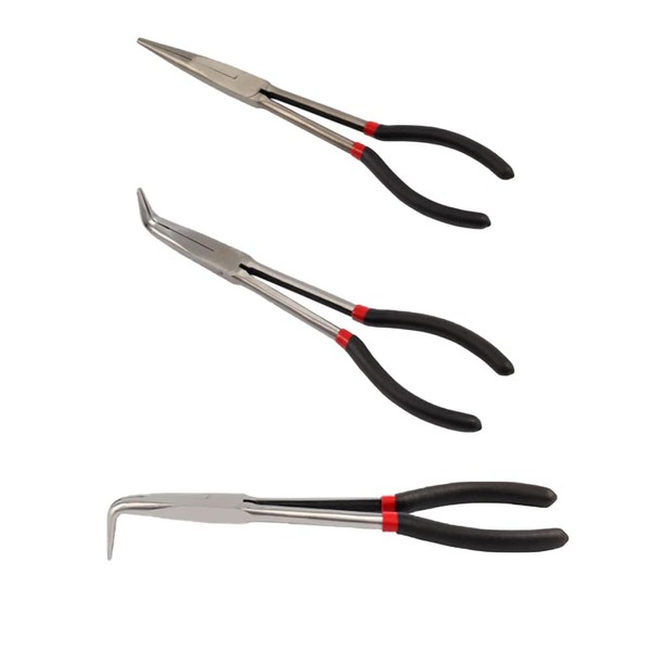 - PACKAGE INCLUDES 1 x Long Nose Pliers 1 x Extended 45 Degree Curved Long Nose Pliers 1 x Extended 90 Degree Curved Long Nose Pliers