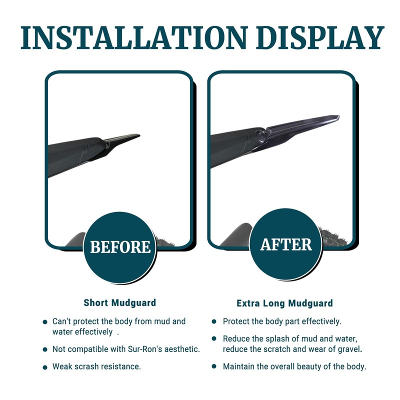 - Streamlined Surron Long Back Fender: The streamlined shape design is intended to reduce wind resistance and noise.The extra long mudguard can effectively protect the body part,reduce the splash of mud and reduce the scratch and wear of gravel,thereby maintaining the overall beauty of the body.