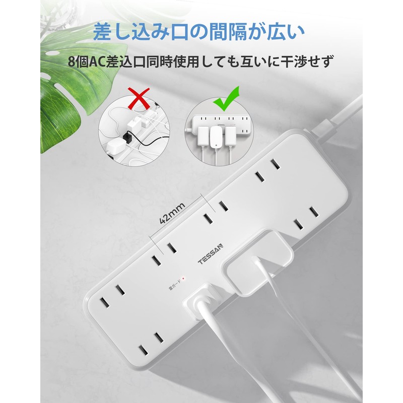 Extension Cord 6.6 ft (2 m) Power Strip with USB Table Tap, 8 AC Outlets, 3 USB Ports, Tessan Octopus Wiring, Oa Tap, Octopus Outlet, Lightning Guard, Bulk Switch Included