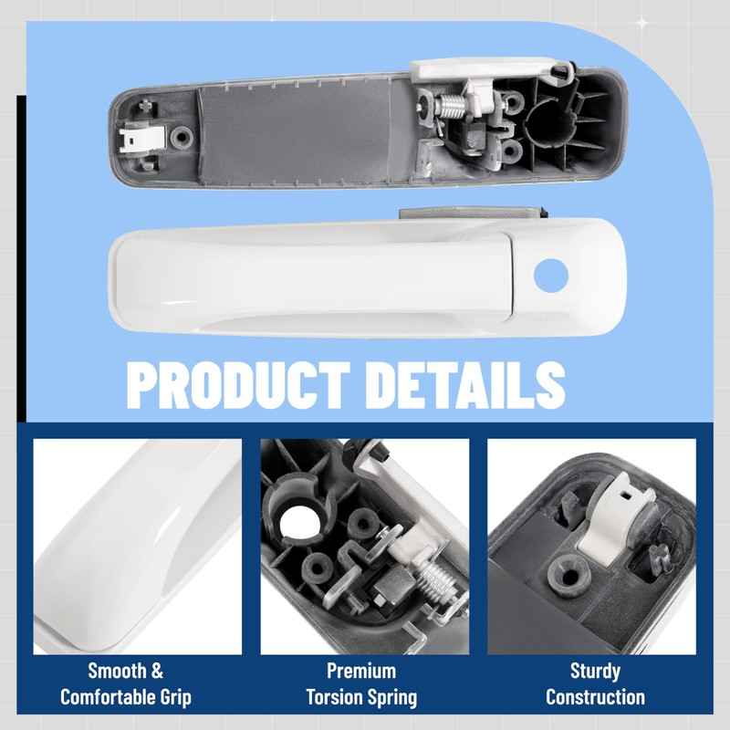 - Improved Style: This door handle comes in a painted white finish that complements the exterior of your vehicle, giving it a modern and sophisticated style. Upgrading to this handle is a simple yet effective way to make a difference to your vehicle