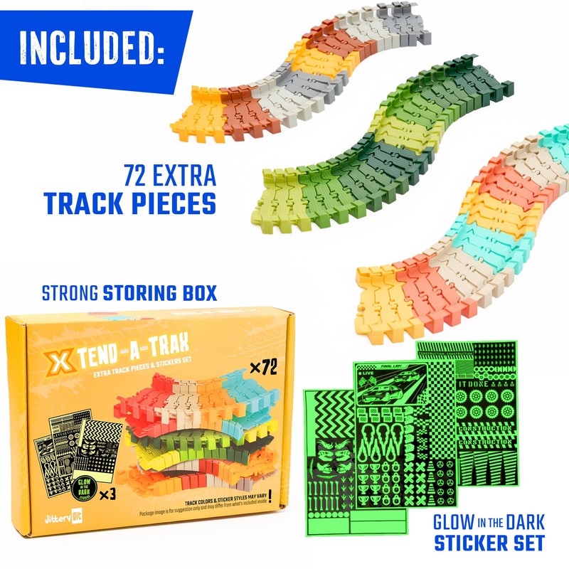 - 【What’s Inside】Includes 72 unique track pieces (styles may vary) and 3 full sheets of glowing stickers. Comes in a durable storage box for easy organization and travel.