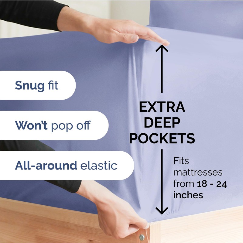 • OTHER LAVENDER QUEEN SHEETS OFTEN PULL LOOSE FROM THE MATTRESS while you’re sleeping and are a struggle to get on your bed, even when you buy the right size. At CGK Unlimited, we’ve designed our lavender queen bed sheets with extra deep pockets to easily fit mattresses 18”–24” deep, so it’s a cinch to put on the bed – even with a mattress topper! our deep fitted lavender sheets queen also feature elastic all the way around its edges to hug your mattress securely – no more balled up sheets!