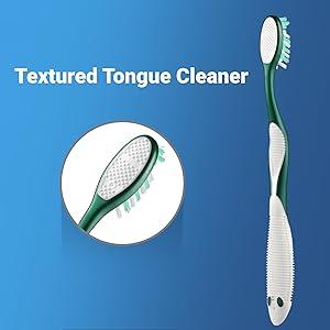 Textured Tongue Cleaner: Located on the back of the toothbrush and helps remove food debris and plaque on your tongue to leave your mouth feeling fresh.