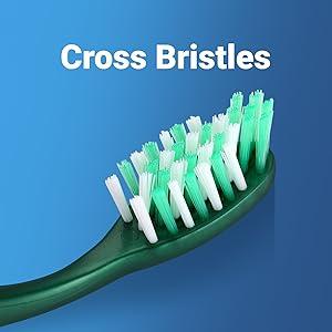 Cross Bristles: Designed to flex and then straighten, actively penetrating between the teeth to lift and sweep plaque away.