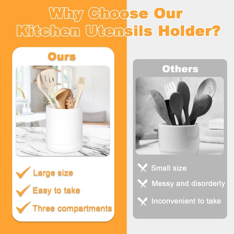 - 【Large and deep】With a size of 5.31 inches high×5.51 inches wide, there are 3 spacious compartments to store various cooking utensils. Large utensil holder is suitable for storing spatulas, ladles, spoons, tongs, egg beaters, knives, chopsticks, cutlery, mashers, forks, etc. Our cutlery rack is genuine!