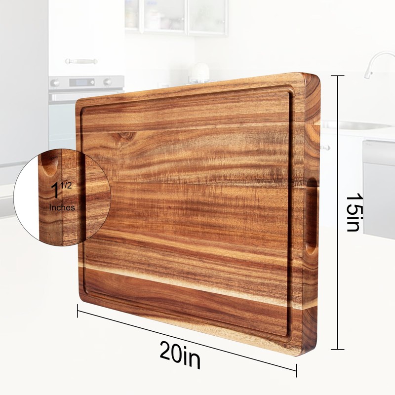 - Premium Craftsmanship: The large Acacia wood cutting board showcases superior craftsmanship, resulting in a durable and strong construction that is not overly thick. Meticulously polished to a smooth and flat finish, the board is free of burrs, cracks, splinters, and other imperfections, ensuring a long-lasting kitchen accessory.