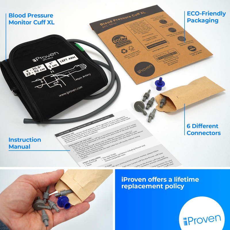 - Simplified Setup: This package includes everything you need for a quick start: a User Guide, a premium iProven Blood Pressure Cuff, a hose, and six universal connectors. The straightforward setup process ensures seamless compatibility with your blood pressure monitor, delivering accurate readings every time.