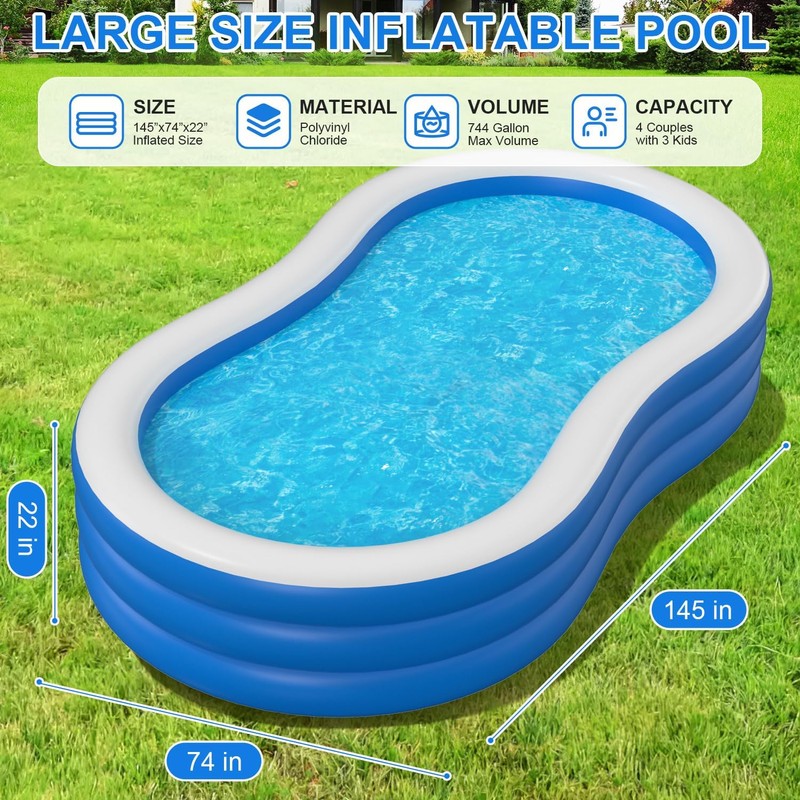 - Big Inflatable Pool - Our oversized pool is 145'' X 74'' X 22'' and the capacity is 744 gallons, it can accommodate up to 6 adults at the same time.