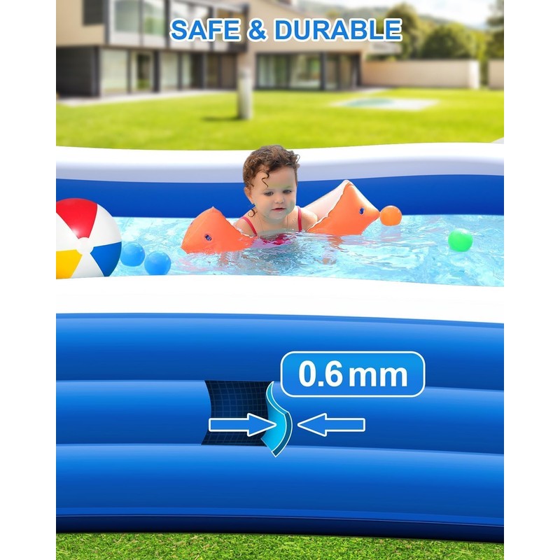 - 0.6mm Thickened Material - The blow up pool is made of 0.6mm thickened pvc, which has excellent puncture resistance, so you don't have to worry about being accidentally punctured.