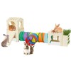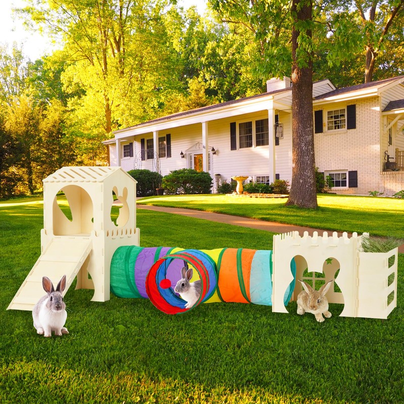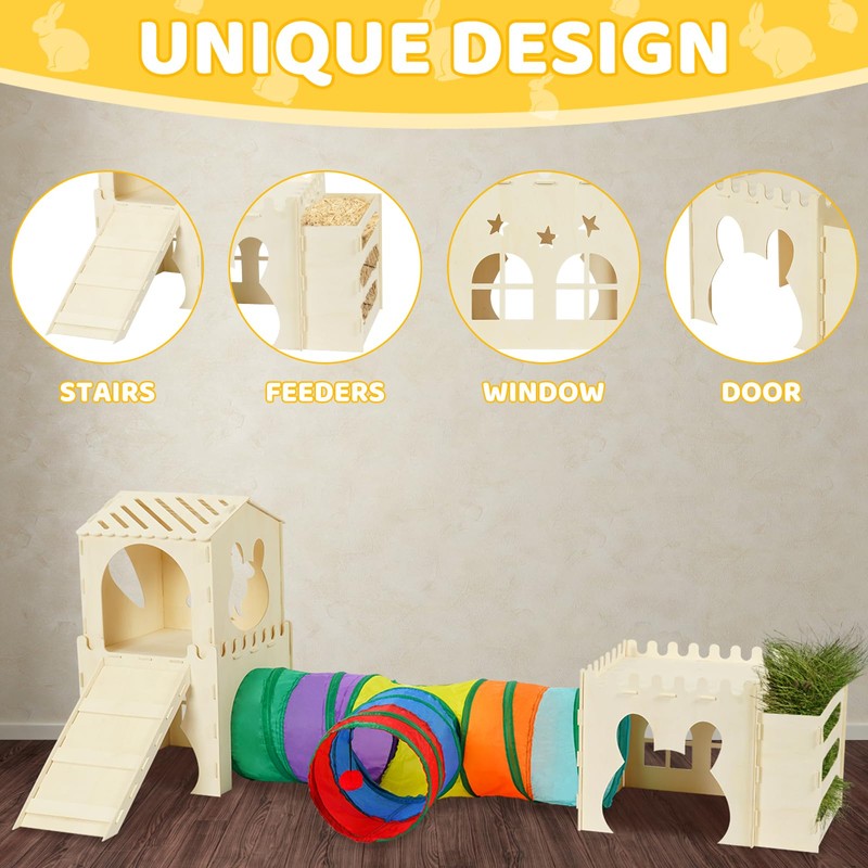 - 【Multi-Story, Multi-Room Exploration Space】 As a spacious rabbit house, it boasts multiple rooms and floors, with 3 ways tunnel design. The open layout meets needs for playing and resting, ideal for active bunnies. Ideal for small animals like Guinea pigs, Bunny, Dwarf Rabbits, Chinchilla, Ferret, Hamster, kitty, Puppy, and other similar-sized small pets, it makes a perfect addition to their cage.
