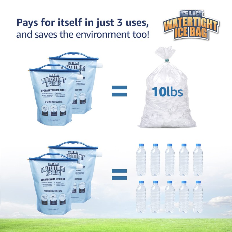 - EXTREME COOLING POWER: Count on our leakproof ice bag for coolers, with its heavy-duty watertight seal bar (MUST SLIDE IN CORRECT DIRECTION). Keep your food and drinks fresh, dry, and cold - without sogginess. Ice Lock Water Tight ice bags help avoid squishy sandwiches and messy cooler cleanups. Fill your freezer packs for coolers with ice cubes, slide to seal, and tuck them in large drink travel coolers, portable coolers, or day beach coolers.