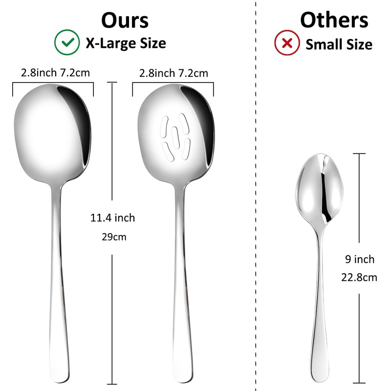 - Extra Size: This silverware set with a length of 11.4 inch and 2.8 inch width, larger and longer than most spoons on the market. The serving spoons stainless steel handles are narrow yet sturdy & the spoon as a whole is really well balanced. Feels good in your hands and no sharp edges. It feels sturdy in the hand without being too heavy or clunky.