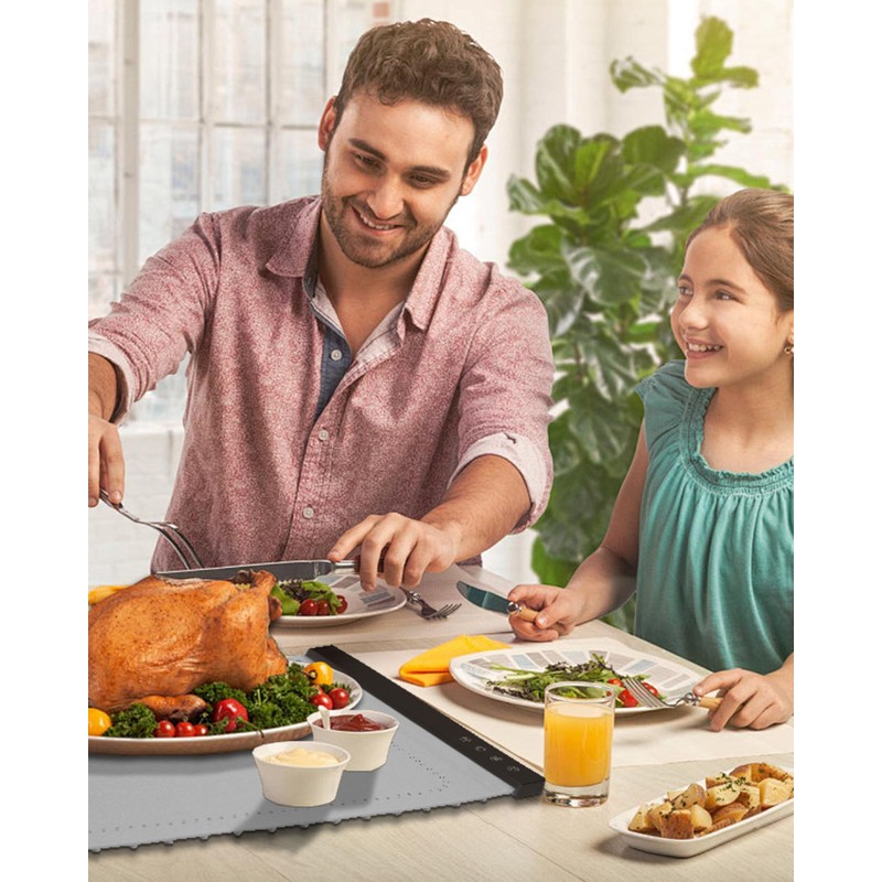 1. Enjoy Quick and Even Full-Surface Heating: Our warming tray features a spacious heating area and a meticulously designed extensive heating wire, ensuring rapid and uniform heating. Arrange your tableware freely while your dishes warm up effortlessly. 2. Portable, Rollable, and Convenient Storage: Easily roll up our warming tray for compact and portable storage – a perfect solution for those on the move. Store it in a bag effortlessly, maximizing flexibility and minimizing storage space. 3. Premium Silicone Nano Material: Experience the excellence of flexible silicone nano material. The panel, carefully chosen for its durability, is resistant to splashes, stains, and oil, providing a foldable and crease-free storage solution. 4. Instant Heating Power: Say goodbye to waiting – our warming tray heats up in just 10 seconds, ensuring your dishes remain warm and inviting. 5. Five-Level Temperature Control: Revel in the convenience of five temperature settings, ideal for both warming and heating, enhancing your dining experience. 6. Versatile Compatibility with All Tableware: Universally compatible, our warming tray suits a variety of tableware and effortlessly adapts to different settings. 7. Perfect for Every Occasion: Elevate your gatherings with this versatile warming tray, perfect for various occasions and scenarios. 8. Energy-Efficient Operation: More than just warmth, our warming tray is focused on energy conservation. It's a mindful choice for your meals and the environment. 9. Considerate Details: From the slim panel design to edge protection against burns, a 1.8m long detachable power cord for flexibility, and a responsive waterproof touch panel – every detail is tailored with your comfort and convenience in mind.