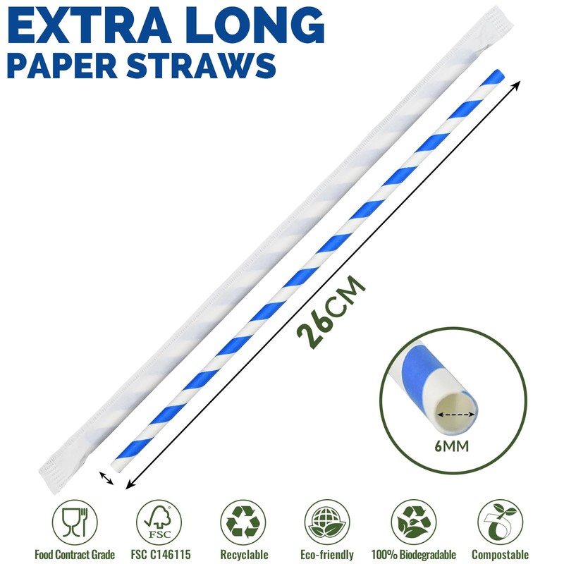 Extra Long Disposable Paper Straws, Individually Wrapped, 26 x 0.6 cm, Colourful Stripes - Pack of 400