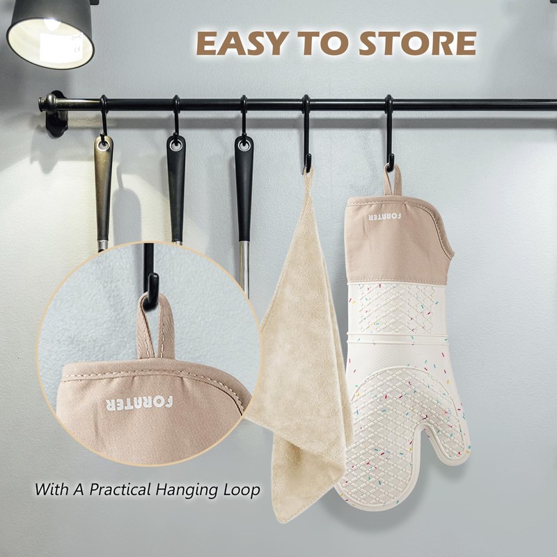 -Thanks to the waterproof and non-stick surface, cleaning these oven mitts is easy. And the cooking mitts come with a handy hanging loop for convenient storage. -These versatile mitts are not only great for baking, cooking, and grilling, but also for outdoor activities like camping, fishing, and BBQs. Plus, they are easy to clean and store, making them a convenient choice for any home chef.