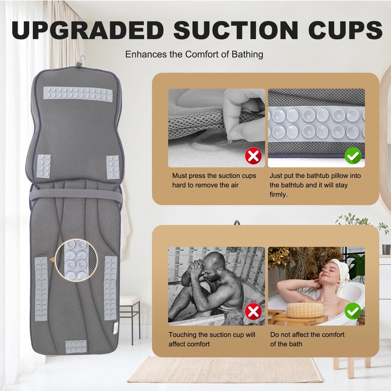 • Upgraded Anti-Slip Suction Cups: High-quality small silicone suction cups with a large number and strong adsorption capacity can easily and quickly fix the bath pillow on the bathtub surface, ensuring a stable and safe bathing process!​