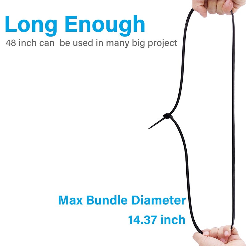 - 【Details】 Length: 48"(1200mm), Width: 0.35"(9mm), Thick:0.08"(2mm), Max bundle diameter: 14.37"(365mm), 12pcs. Our huge zip ties is stronger than most 48" zip ties in the market