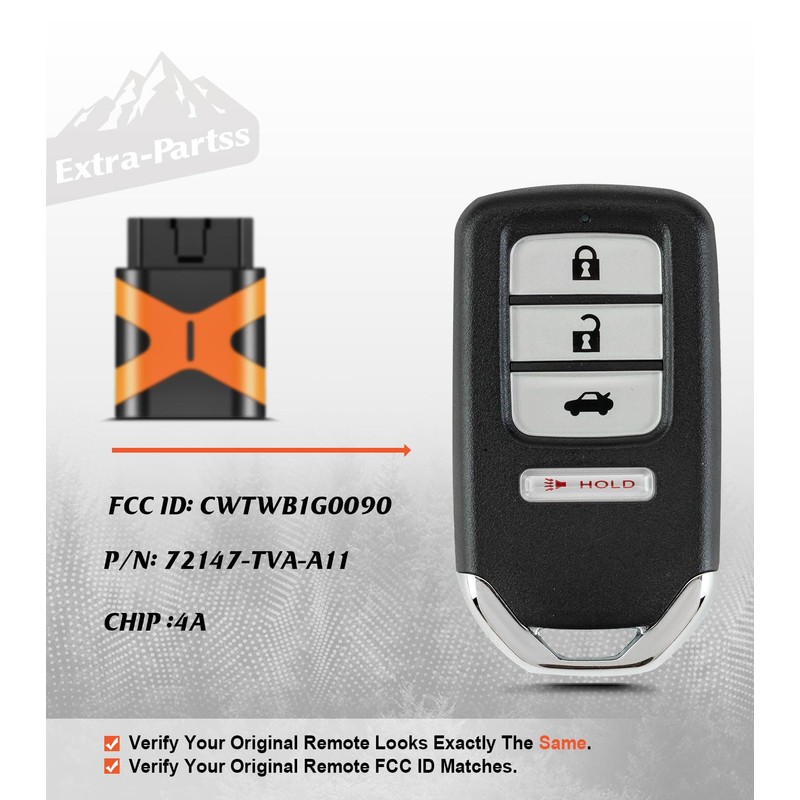 - ๐ฅ๐๐ ๐ข๐ง๐ ๐๐๐๐ง๐จ๐ฅ๐ โ Replacement smart remote keys that look and function like the original. Only work for FCC ID CWTWB1G0090 fits 2018-2022 Accord LX Sport 20SPT. For complete compatibility list, please check our product description