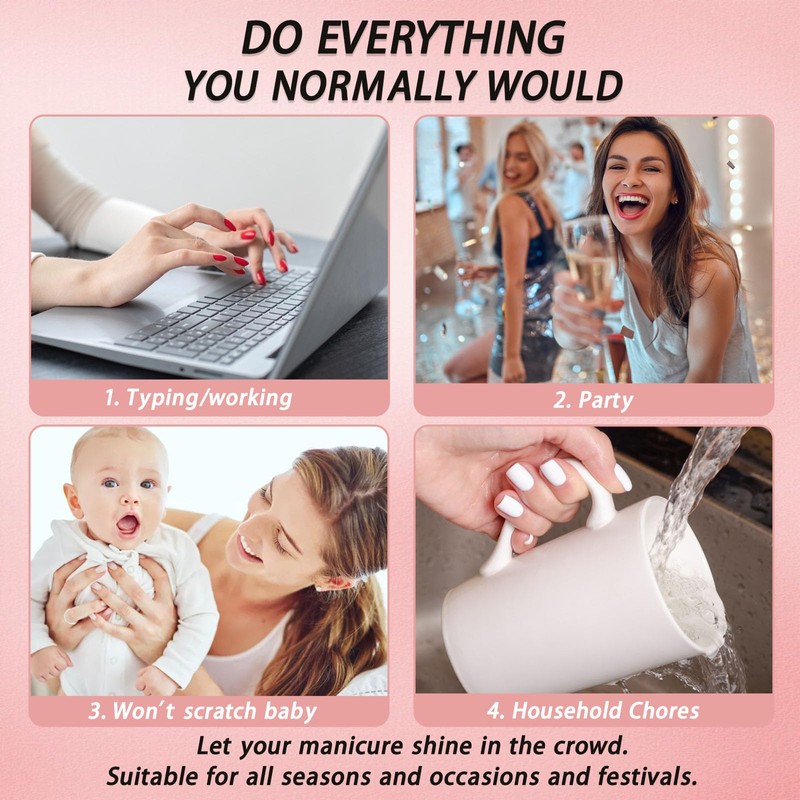 - Full cover acrylic nails, suitable length, make your glue on nails slim and have a very realistic appearance. Press on nails in water for 10-15 minutes, gently peel off at the edge, and will not cause damage to your natural nails.