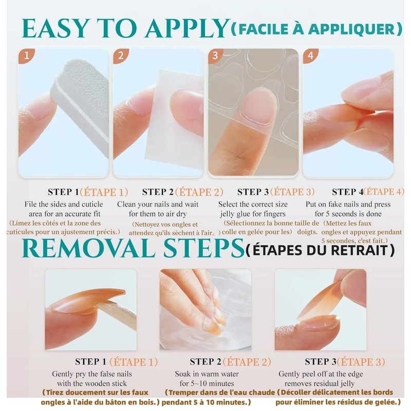 - 【Simple Operation】- You can change you nails style in 10 minutes anytime and anywhere,Instead of spend lots time and money at nail salon. Just clean your nails,then choose the right nail size,stick double-sided adhesives on nails and press for a while,you can have beautiful nails in just a few simple steps.