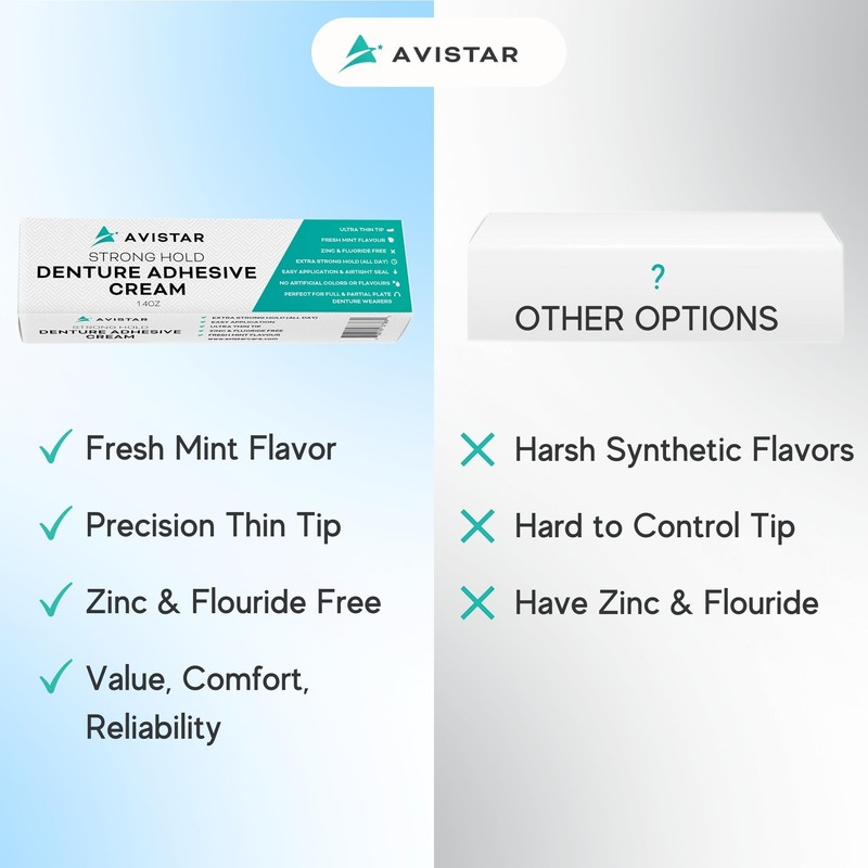 Feel Extra Fresh For Longer Avistar has made sure that your application of the cream is just as positive as the preparation. With a cool mint flavour, your adhesive cream will not only go on smooth, but it will feel great too. To top it all off, Avistar’s formula has been tested to last all day. Avistar packs series value with no hassles, we promise!