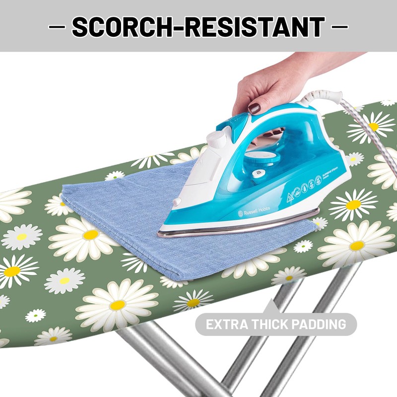 - EXTRA THICK MATERIAL FOR BETTER IRONING: This sage green white daisy spring flowers ironing board cover adopts natural breathable cotton with scorch resistant finish as cover. Using ultra thick stitched fibers, the thickness can reach 6mm. This synthetic fiber evenly radiate heat and steam, achieve high temperature ironing and safer