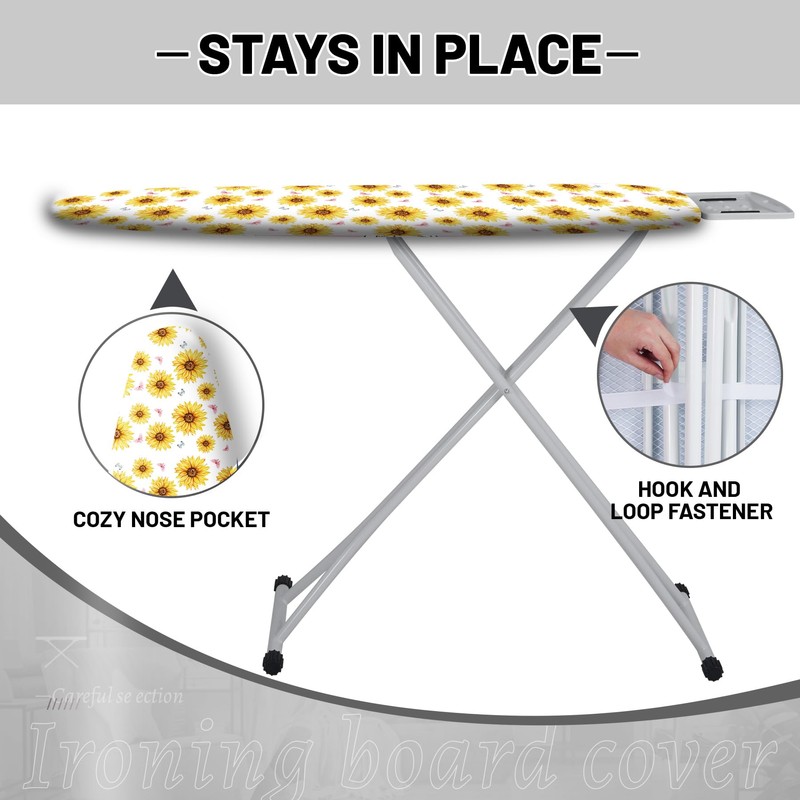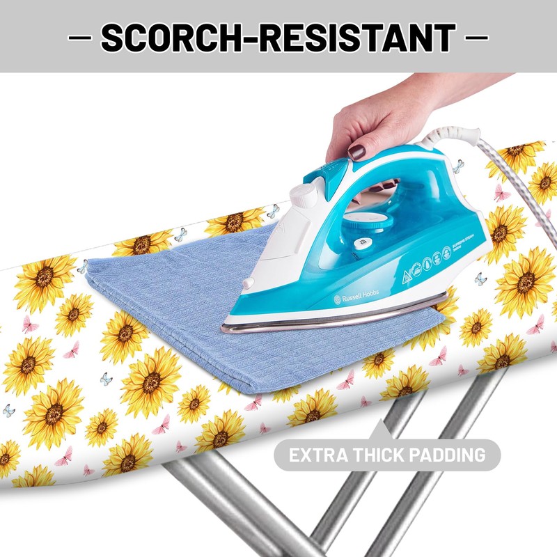 - EXTRA THICK MATERIAL FOR BETTER IRONING: This Summer Sunflowers ironing board cover adopts natural breathable cotton with scorch resistant finish as cover. Using ultra thick stitched fibers, the thickness can reach 6mm. This synthetic fiber evenly radiate heat and steam, achieve high temperature ironing and safer
