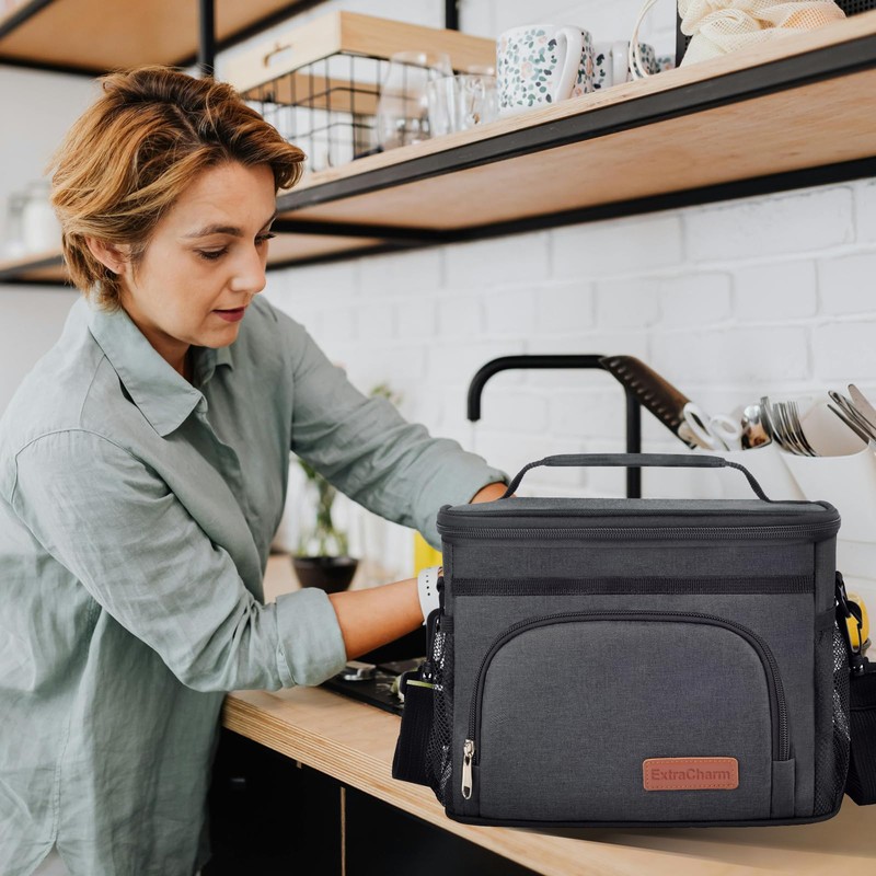 ExtraCharm ExtraCharm Insulated Lunch Bag for Women/Men - Reusable Lunch Box for Office Picnic Hiking Beach - Leakproof Cooler Tote Bag Organizer with Adjustable Shoulder Strap for Adults - Black