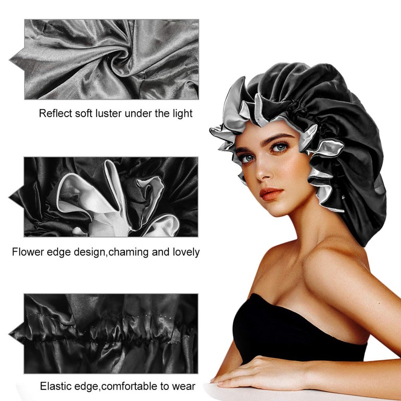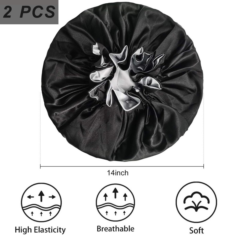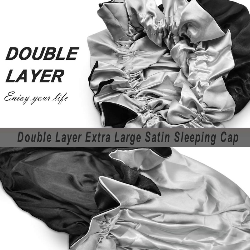 Extrapins 2 PCS Double Layer Extra Large Satin Sleeping Cap,Silk Bonnets for Women,Satin Bonnet for Curly Hair with Elastic,for Women Girl(Black)