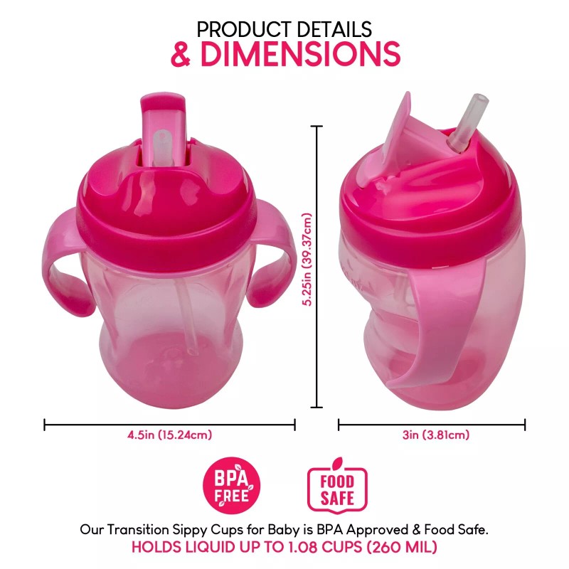 - Transition sippy cups for baby is BPA-Free and Food Safe; Measures 5.25- by 4.5- by 3- inch (39.37- by 15.24- by 3.81- cm) and can hold liquid up to 1.08 Cups (250 ml)