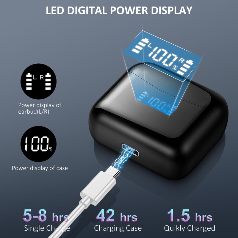 - 42 Hours Long Playtime, Dual LED Power Display and USB C Fast Charging: Get 5-8 hours of battery life on a single charge with a case that extends it to 42 hours. The compact charging case supports USB-C wired fast charging. The digital LED power display on the charging case show the power level for charging case and wireless earphones, You'll never have to worry about battery life even on long trips.
