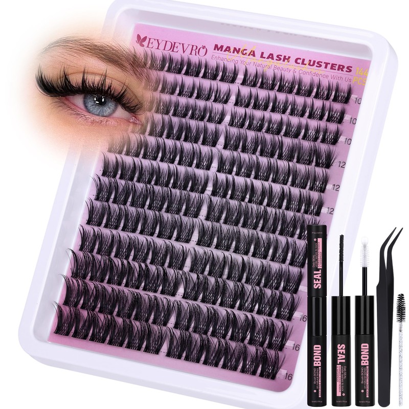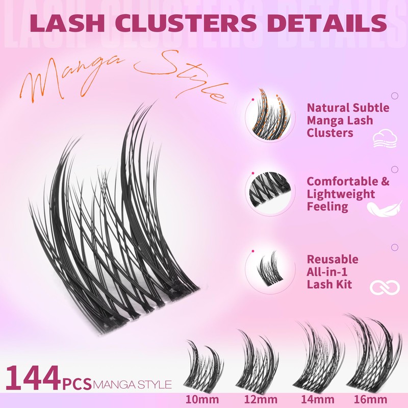 - Long-Lasting & Reusable Lash Extension Kit: The lash extension kit includes everything you need-lash bond and seal, tweezers, brush, and 144 pcs natural manga cluster lashes-for multiple uses. The strong hold waterproof lash bond and seal can make your lash clusters stay curly for up to 48h! Save cost and time while enjoying salon-quality DIY lash extensions at home!